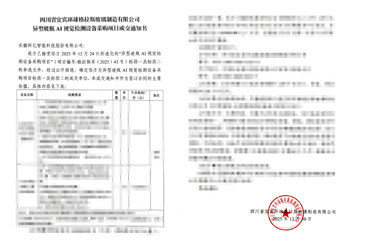 As the year draws to a close, good news keeps coming. Anhui Keye Intelligent Technology Co., Ltd. (hereinafter referred to as Keye Tech) has once again won the bid for the special-shaped glass liquor bottle visual inspection equipment procurement project of Sichuan Yibin Global Glass Manufacturing Co., Ltd., a wholly owned subsidiary of Wuliangye Group.