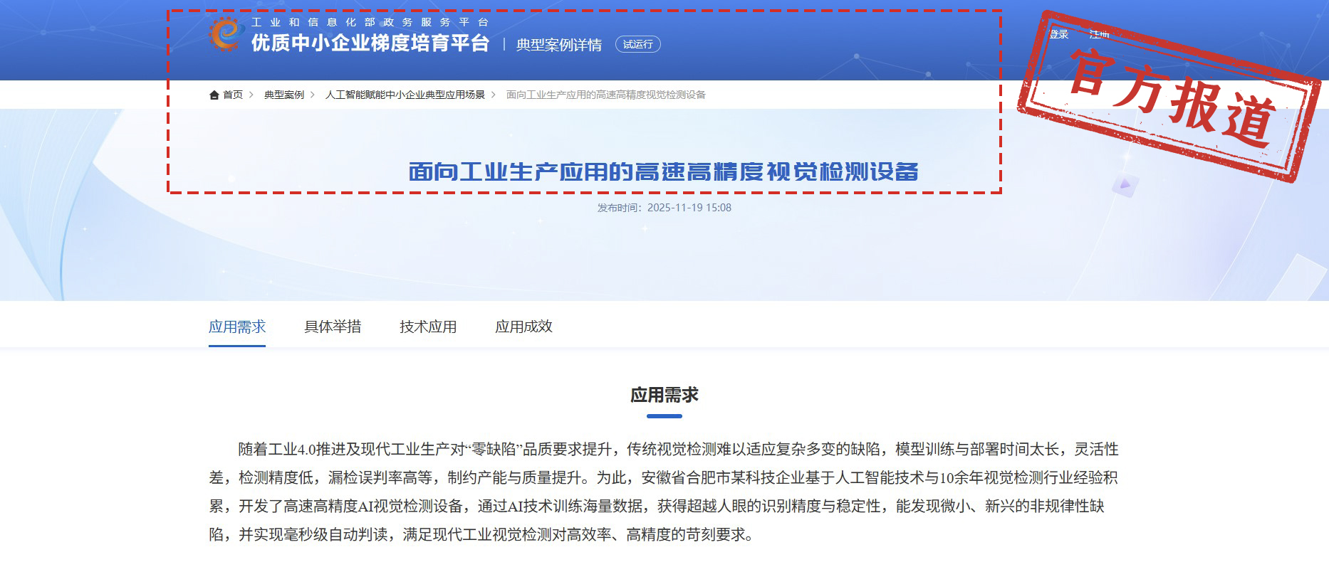 Recently, the SME Information Network, under the Ministry of Industry and Information Technology (MIIT), featured an in-depth report titled "High-Speed, High-Precision Visual Inspection Equipment for Industrial Production." The report provides a comprehensive analysis of Anhui Keye Intelligent Technology Co., Ltd., detailing how the company's proprietary AI vision technology is overcoming critical industrial inspection bottlenecks and supporting high-quality manufacturing development. This serves as a compelling case study in advancing China's manufacturing prowess strategy.